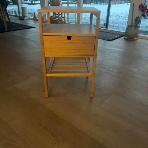 Fint sengebord i rattan, desværre har vi ikke længere plads