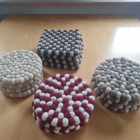 Den ægte kugletæppe vare fra butikkerne . Nu rydder vi op til familie jul. Du får tilgengæld så mulighed for en hurtig og god julegave til dem der ellers har alt....Brug den som bordskåner eller som sæde til taburet eller stol. prisen er samlet for begge to og aldrig brugt. Jeg har 3 sæt