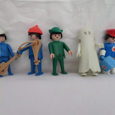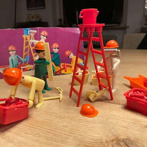 Vintage. 1980/90-erne. Play mobil sæt med 4 arbejdsfigurer og tilbehør, herunder hjelme, forskellige vejskilte, værktøj, stige og andre arbejdsrelaterede genstande. Materialet er plast. Sættet indeholder flere små dele til leg og samling,. eller til videresalg.
