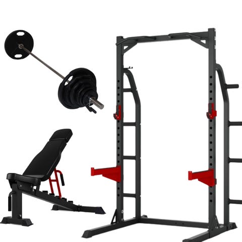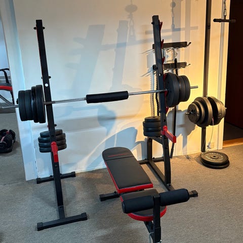 Peak Fitness Skråbænk, squat stativ inkl. 110 kg. vægtsæt - 30 mm. sort støbejern.