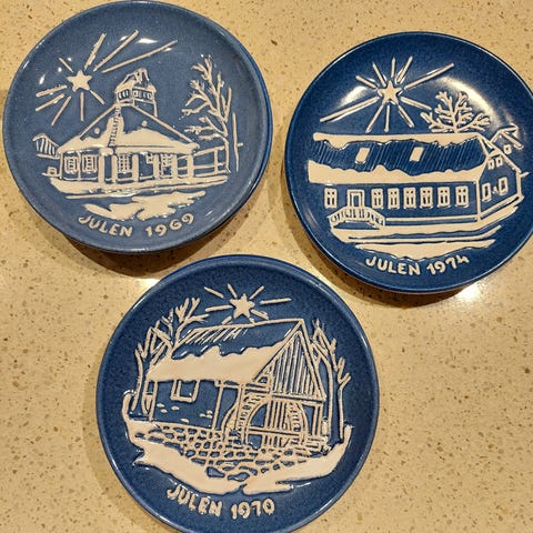 Johgus Bornholm juleplatte fra 1969 og håndmalet med klassisk julemotiv.