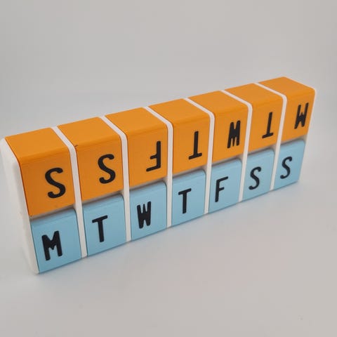 Pilleæske fremstillet i blå plast med separate rum til hver dag i ugen (mandag til søndag).