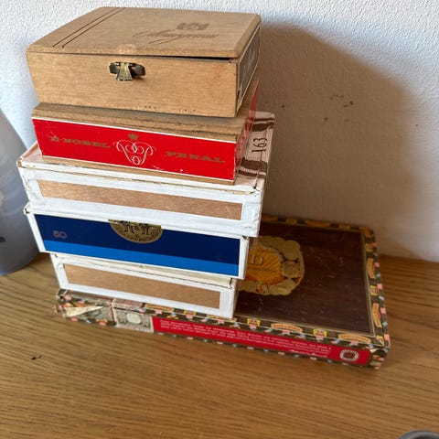 Sjov og usædvanlig julegave fra 1932, nok privat fremstillet. Trætønde med tætsluttende trælåg. Totahøjde 17 cm. 7 Cm. Ø. Gedigent metalskilt med " 7 CIGARER / JULEN 1932 R&S Q". Tæt, ingen revner.