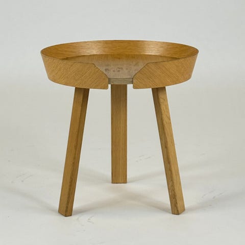 Around Table fra Muuto er designet af Thomas Bentzen og er et fint eksempel på moderne nordisk design, hvor funktionalitet og æstetik går hånd i hånd. Denne version med en diameter på 45 cm er den mindste i serien og egner sig perfekt som sidebord ved sofaen, natbord i soveværelset eller som fleksibelt afsætningsmøbel i loungen. Bordet er udført i finer og massivt egetræ og kendetegnes af sin karakteristiske opadvendte kant, som både indrammer formen og forhindrer genstande i at glide af. De tre let skrånende ben giver bordet et stabilt, men legende udtryk. Med sin varme træfinish og enkle konstruktion tilfører Around Table et tidløst og indbydende element til enhver indretning.