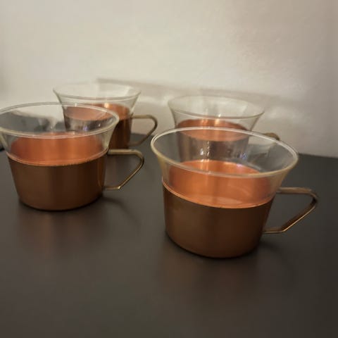 Kopperne kan bruges både som thekopper og kaffekopper, og hele sættet fremstår i god stand med let brugspatina. Et elegant og dekorativt glasstel, perfekt til både hverdag og servering for gæster.