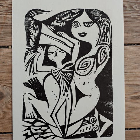 Lille fint og grafisk lækkert linoleumssnit, med andet værk på bagsiden, ukendt kunstner 19 x 24 cm.