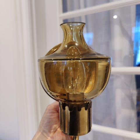 Væglampe med opal glasskærm og messing. Den har patina på messingdelen.