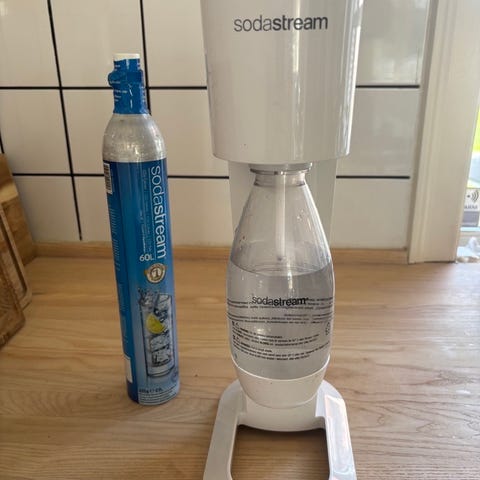 Der medfølger en fyldt gas patron med op til 60 liter dansk vand og 2 tilhørende SodaStream flasker i sort og grå.