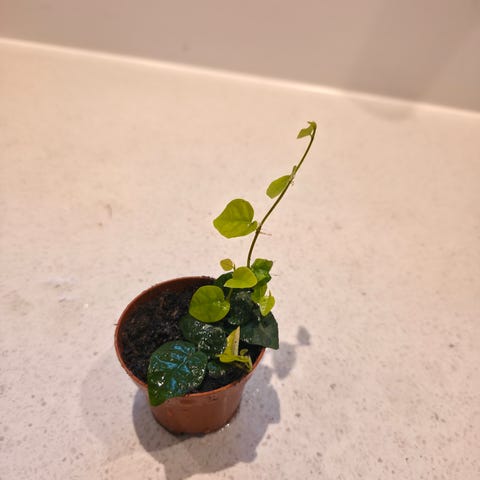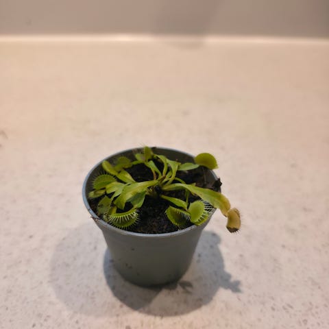 Venusfluefanger er en kødædende plante med grønne blade og fangstmekanismer. Planten er placeret i en sort plastpotte og er egnet til indendørs dyrkning.