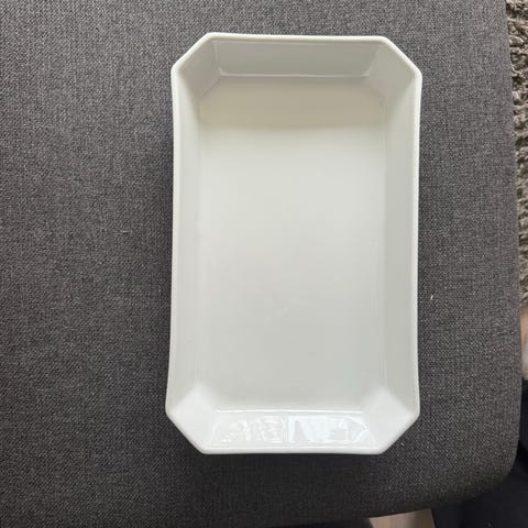Arabia Aura Fad i hvid med blå kant. Fadet har et enkelt design. Det er velegnet til servering og opbevaring i køkkenet. Fremstillet i Finland, modelnummer 9.32.5.
