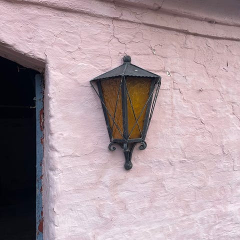 Smuk og charmerende udendørslampe i smedejern med originalt gul/amberfarvet glas og håndsmedede detaljer. Lampen har et klassisk lanterne-design, som passer ideelt til ældre ejendomme, landhuse, gårde, sommerhuse eller projekter med historisk eller rustik stil.