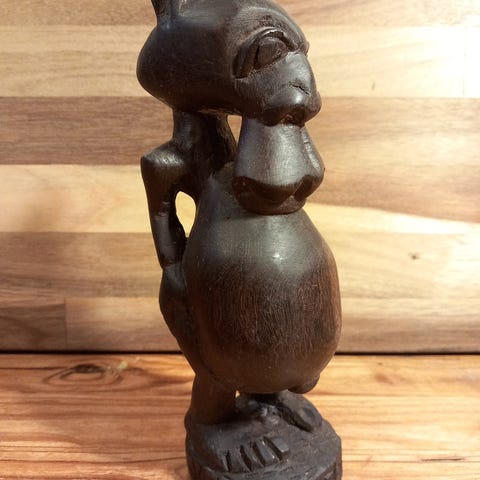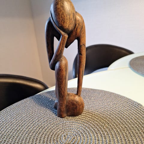 Træskulptur i abstrakt form, fremstillet i mørkt træ. Skulpturen har en slank og buet struktur med glatte overflader og fremhæver en stiliseret menneskelig figur. Velegnet som dekorativt element i hjemmet eller kontoret, 32 cm høj.