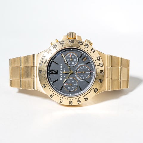 En imponerende Bulgari chronograph i solid 18k guld, der kombinerer luksus, præcision og italiensk design. Den mørke skive med tre subdials giver et sporty og sofistikeret udtryk, mens den kraftige guldlænke understreger urets eksklusive karakter. Et automatic værk sikrer driftssikker performance, og tachymeter-bezelen fuldender det funktionelle design. Perfekt til samleren, der ønsker et markant statement-piece fra Bulgari.