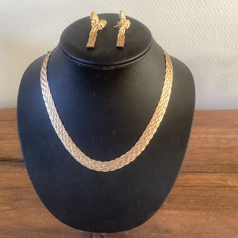 Meget smuk retro smykkesæt bestående af halscollier, broche og øreringe af 14 karat guld og prydet med turkis. Stemplet 585 og mesterstempel (HS, Herman Siersbøl ? ). I fin stand, æske følger med. Mål: Collier: L. 42x0,7 cm, broche ca. Ø 4 cm, øreringe 5,5 cm, 25 gr. Til salg 9.500 kr.