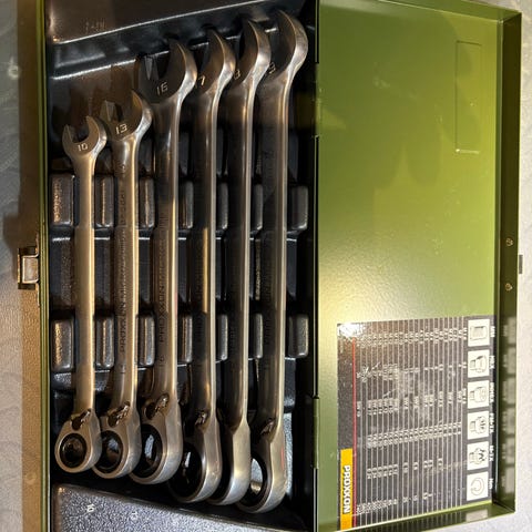 skraldenøglesæt bestående af tre sæt med forskellige størrelser og forskellige antal dele. Sættene indeholder skraldenøgler, forskellige toppe og forlængere. Materiale er metal med kromfinish.