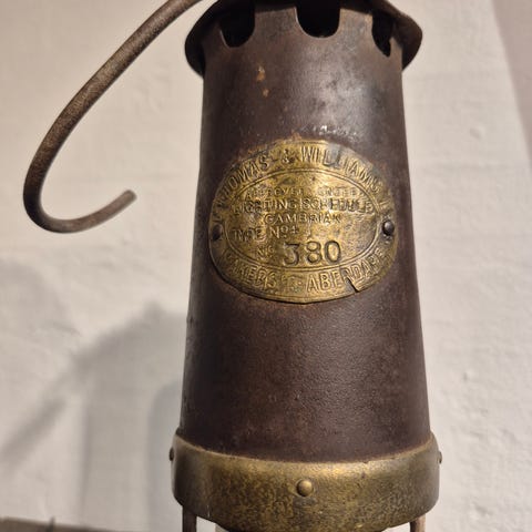 Fin antik engelsk nummereret (404) minelampe i messing og sortmalet stål. gedin kvalitet. Har fået sine brugsknubs men intakt.