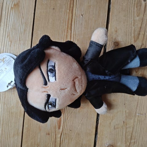 Harry Potter Bamse Legetøj i sort og gul farve. Blødt materiale egnet til børn. Produktet forestiller en karakter med briller, tryllestav og sort kappe med gul lynmotiv.