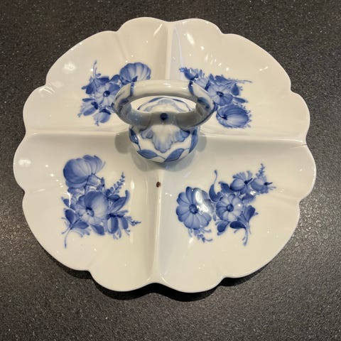 Royal Copenhagen Blå Blomst Kabaretfad i porcelæn med fire sektioner og et centralt håndtag. Fadet er dekoreret med det klassiske blå blomsterdesign og er velegnet til servering af forskellige småretter eller snacks.