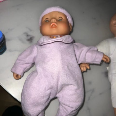 Baby Born dukke med blå øjne iført hvidt tøj. Dukken er designet til børn og har en blød krop med detaljerede ansigtstræk.