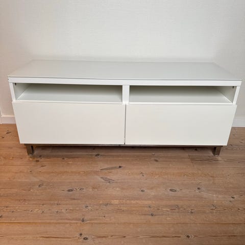 Ikea TV bord (120x40x38cm) med justerbar fødder og hul i top og bagbeklædning til kabler. Har enkelte hak foran. Se billederne.