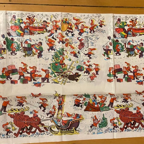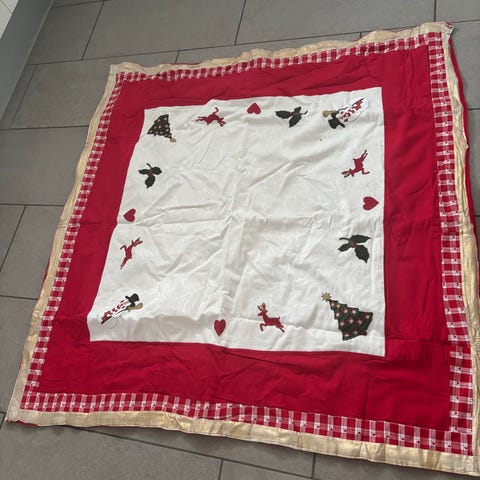 Julevægophæng med svensk tekst. Kraftig bomuld i blå og hvide farver. 2 æsken noteret så det er nemt at hænge op. Måler 50x48cm . En enkelt lille plet i kanten men ellers fin stand. Pris kr 75