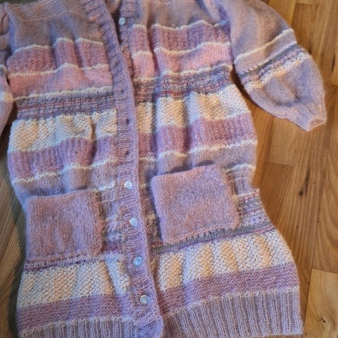 Håndstrikket trøje strikket i 1 tråd lammeuld og en tråd kid mohair.