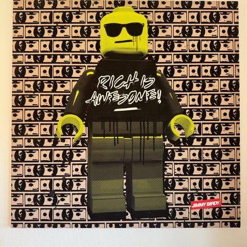 Hello Kitty maleri i graffiti stil med blandede farver og tekst. Kunstværket viser Hello Kitty-figuren omgivet af forskellige grafiske elementer og tekstfragmenter. Maleriet er egnet til vægdekoration og har et moderne, urbant udtryk.