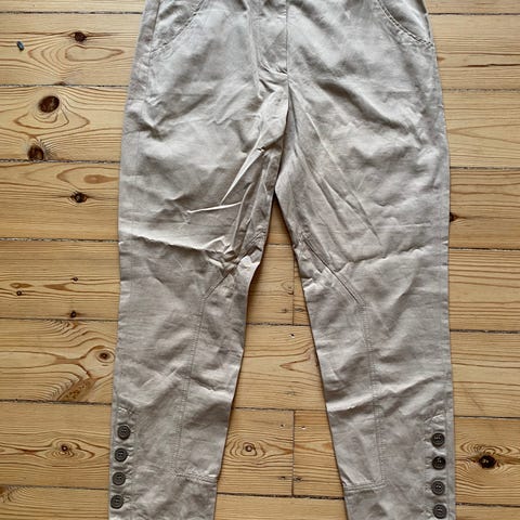 Meget smukke 100% uldbukser i super kvalitet. Brede ben med pressefolder, bredt opsmøg, stiklommer samt baglommer med stofknapper. Foer til knæene. Nyrenset