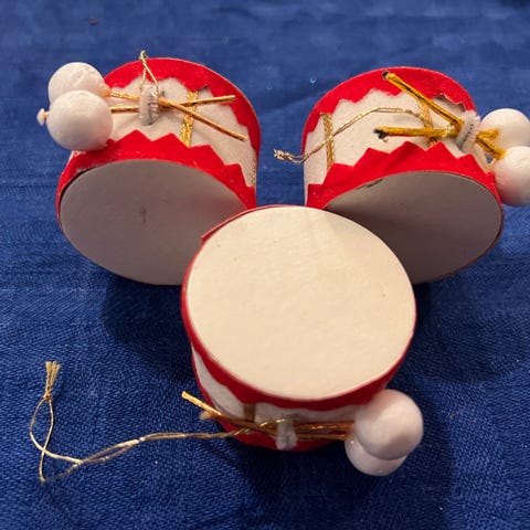 Gammelt julepynt trommer, 4 stk sælges samlet