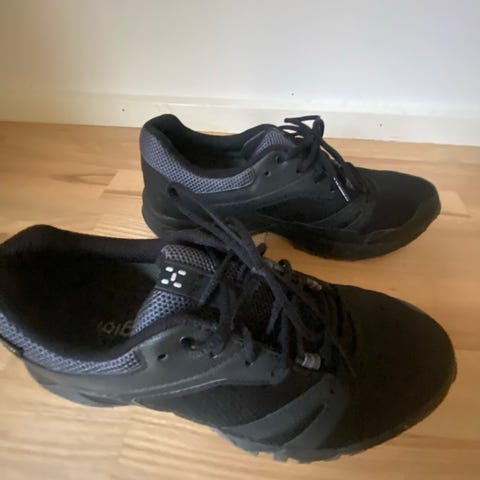 Haglöfs sneakers i størrelse 38, sorte. Skoene har en robust sål med mønster for bedre greb og er designet til udendørs brug. Materialet er slidstærkt og velegnet til forskellige vejrforhold.