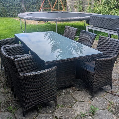 Udendørs spisebordssæt med bord, stole og bænk i flet og træ.