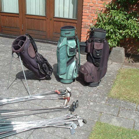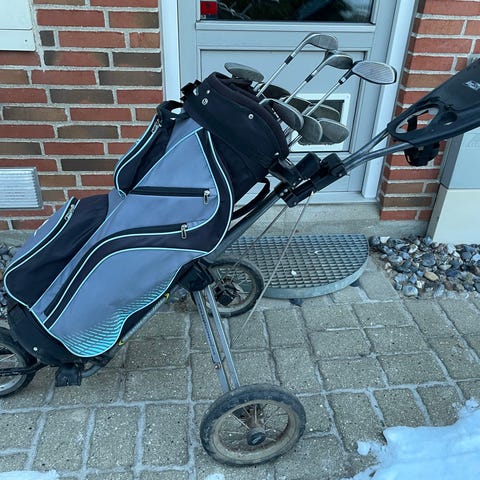 Wilson golfjern sæt med forskellige jern, inklusive 3, 4, 5, 6, 7, 8, 9 og P. Sættet leveres med en golfvogn med tre hjul, sort og vinrød farve. Golfvognen har et håndtag til nem transport og opbevaring af golfjernene.