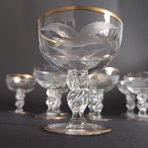 Alle glas er i perfekt stand, guldkanterne er intakte og glasmassen er klar og skinnende, .