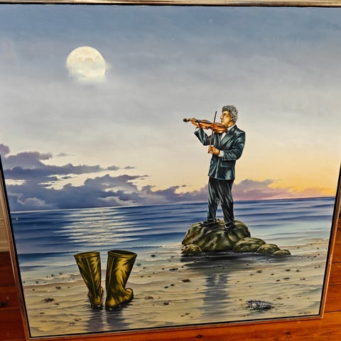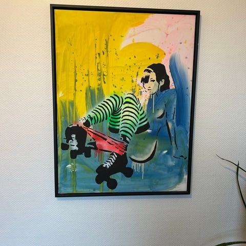 Kim Balzer er kendt for sine drømmende og surrealistiske strandmotiver. Dette er et af hans mere boligvenlige og dekorative malerier.