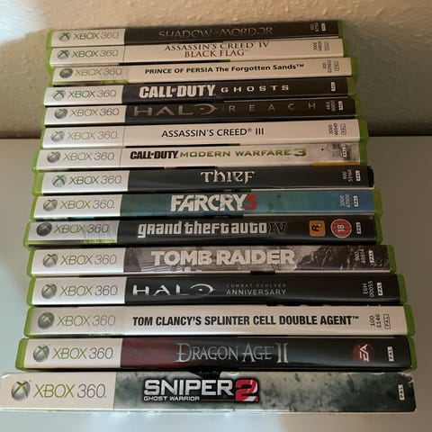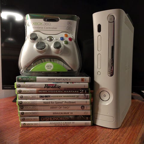 Xbox 360 konsol med tilhørende kabler og controller, men ingen strømkablet. Inkluderer en samling af spil