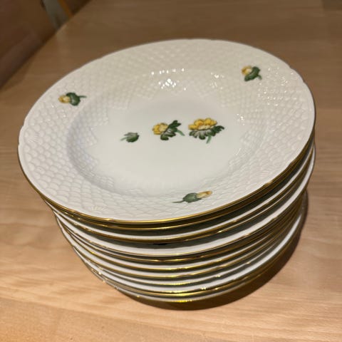 Stor dyb suppetallerken. Erantis Mrk. B&G Kjøbenhavn made in Denmark 22. diameter 24.5 cm. Bing & Grøndahl Hvid / creme tallerken med flot blank glasur, tallerkner dekoreret med Gule erantis med grønne blade. Der er 5 tallerkner i fin stand med smuk guldkant. (Skælform, det er ikke Æbleblomst eller Heimdal-Jasmin, der har samme form)
