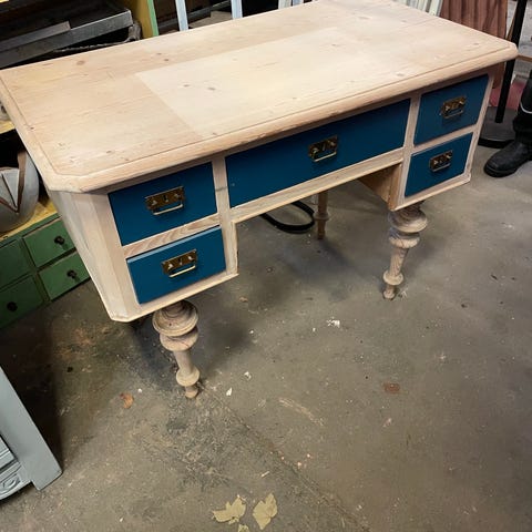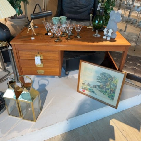 Fritstående skrivebord i Eg, med reol og 6 skuffer. Pæn stand med lidt slid på bordpladen. ,Afhentes i:,Røde Kors Arden (801),Bemærk at mail, chat og beskeder ikke besvares, og varen skal købes på knappen "Gå til varen"