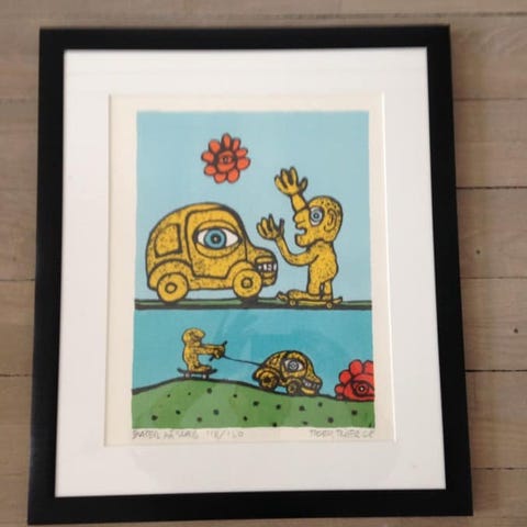 Produktet er et oliemaleri indrammet med en gylden ramme. Motivet viser en landskabelig scene med græsmarker og træer.huse i baggrunden Rammen lidt skrammet .,Afhentes i:,Røde Kors Virum (173),Bemærk at mail, chat og beskeder ikke besvares, og varen skal købes på knappen "Gå til varen"