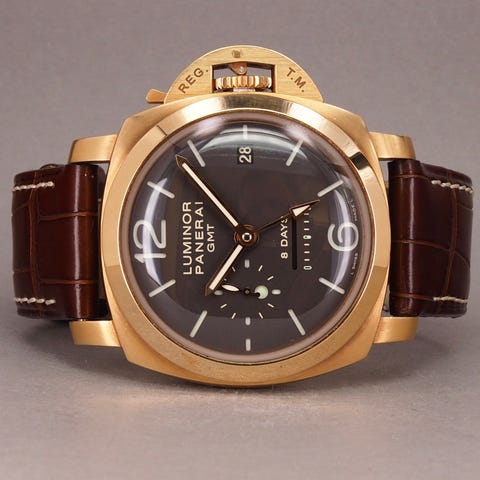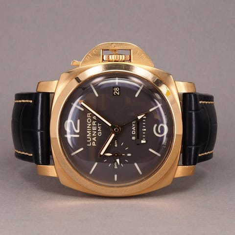 Klassisk og kraftfuld Panerai Luminor 1950 Marina med 44 mm urkasse i børstet titanium og brun skive med gyldne visere. Uret drives af Panerais in-house Caliber P.9000 – et automatisk værk med 3 dages gangreserve, small seconds, datovisning og 300 meters vandtæthed.
