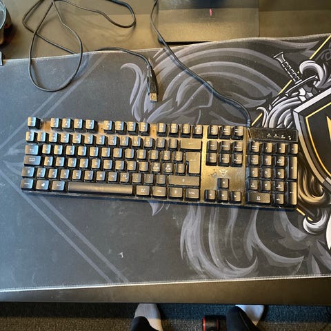 ADX Gaming Tastatur med USB-forbindelse, sort og orange farvet, designet til gamingbrug. Tastaturet har layout med standard taster og ekstra funktionstaster. Materialet er plast med et robust design. Passer til brugere, der ønsker et kablet tastatur til stationær computer.
