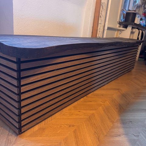 Bænken måler 148 cm i længden og 42,5 cm i dybden. Bænken er lavet i mørkt valnødde træ og i fin stand uden mærker eller slid. Vi omorganiserer vores entre og derfor sælges bænken.