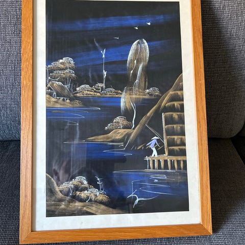 Smukt japansk (kinesisk?) originalt silketryk i ramme