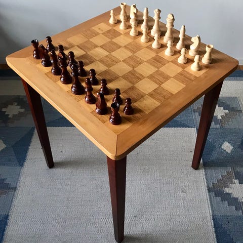 Lavet i massiv bøgetræ, ligesom brikker er i udskåret træ