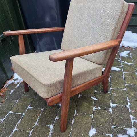 Flot lænestol med teak armlæn og vistnok bøg stoleben.