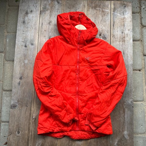 Arc’teryx Atom LT Hoody i str. S – en sjælden specialudgave i strålende gul, lavet fra Pikkori Sport i Nuuk, Grønland. Jakken har hætte, to lynlåslommer og justerbar snøre forneden, samt det ikoniske Pikkori-logo på ryggen.