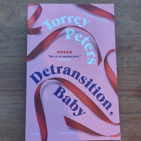 Torrey Peters Detransition, Baby Bog. Bogen er skrevet på engelsk og omhandler temaer omkring køn, identitet og familieforhold. Den indeholder 288 sider og er udgivet af forlaget Hogarth.