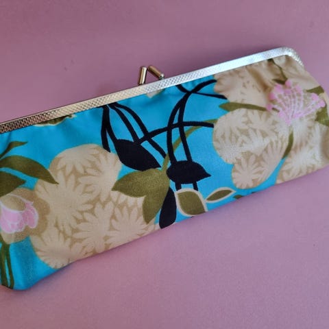 Makeup pung, Vintage, retro, Skøn lille makeup pung, med et lynlåsrum og spejl. Lysegul med hvide striber. Kan tørres af med en våd klud.