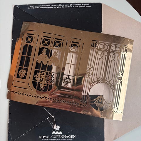 Julelyslygte fra Royal Copenhagen lavet af Jette Frölich. Har en lille skade når den skal samles. (Jeg bruger tape/ guldsnor). Højde 21 cm, diameter 12 cm. Foldes ud ved opbevaring. Er i original karton til opbevaring.
