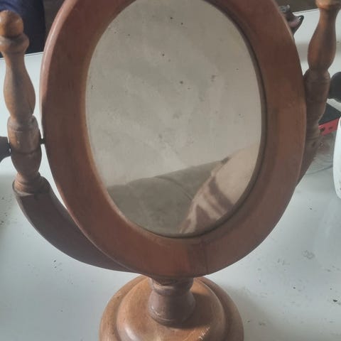 Anden type spejl, b: 40 h: 165, Barberspejl, antik oldefars barberspejl med rum til barber grej... spejlet er desværre revnet og møblet bærer præg af at være antik med det slid der måtte være i den forbindelse.