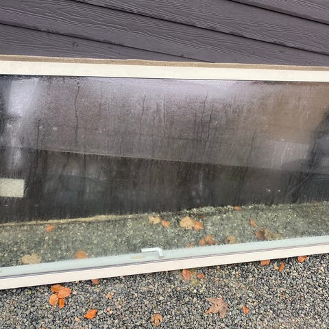 Dobbelt havedør med karm, sprosser og 8 vinduer. Døren har kun håndtag indvendigt.